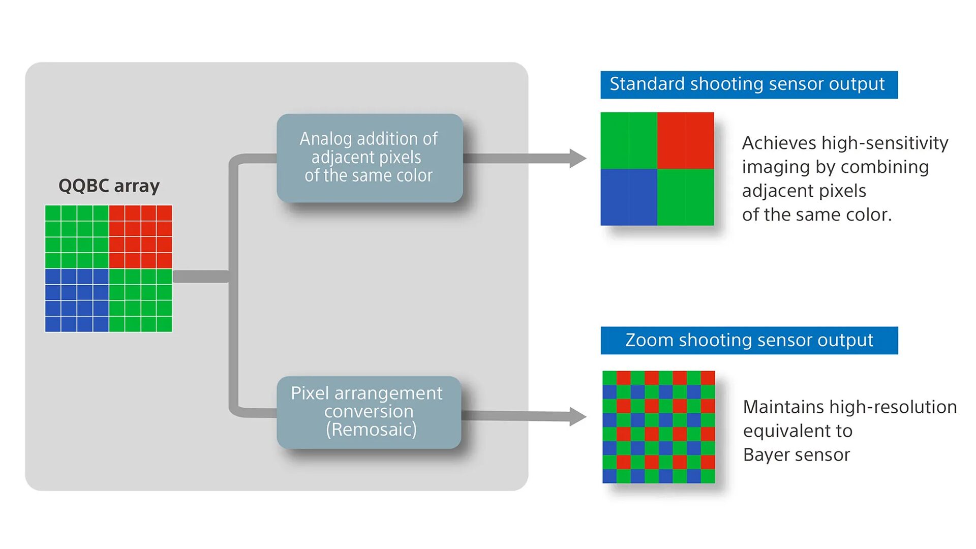 さらにピクセル構造とカラーフィルター設計の進歩により、彩度信号レベルが上昇し、ダイナミックレンジの改善しています。そして2つ目としてはワッドクワッドバイエルコーディング(QQBC)アレイを採用し、16(4×4)の隣接ピクセルが同じ色のフィルターでクラスター化しています。