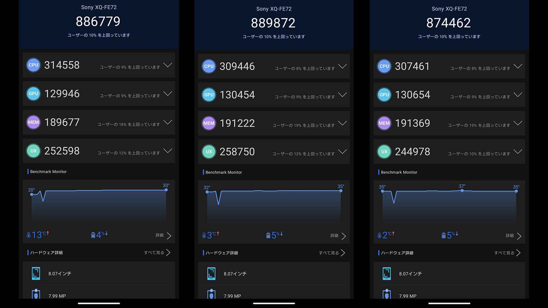 一方でXperia 10Ⅶは最大2TBまで拡張可能になっていますが内部ストレージは128GBまでです。そして発熱の程度を調べるためにベンチマークを3回連続回して負荷をかけてみました。