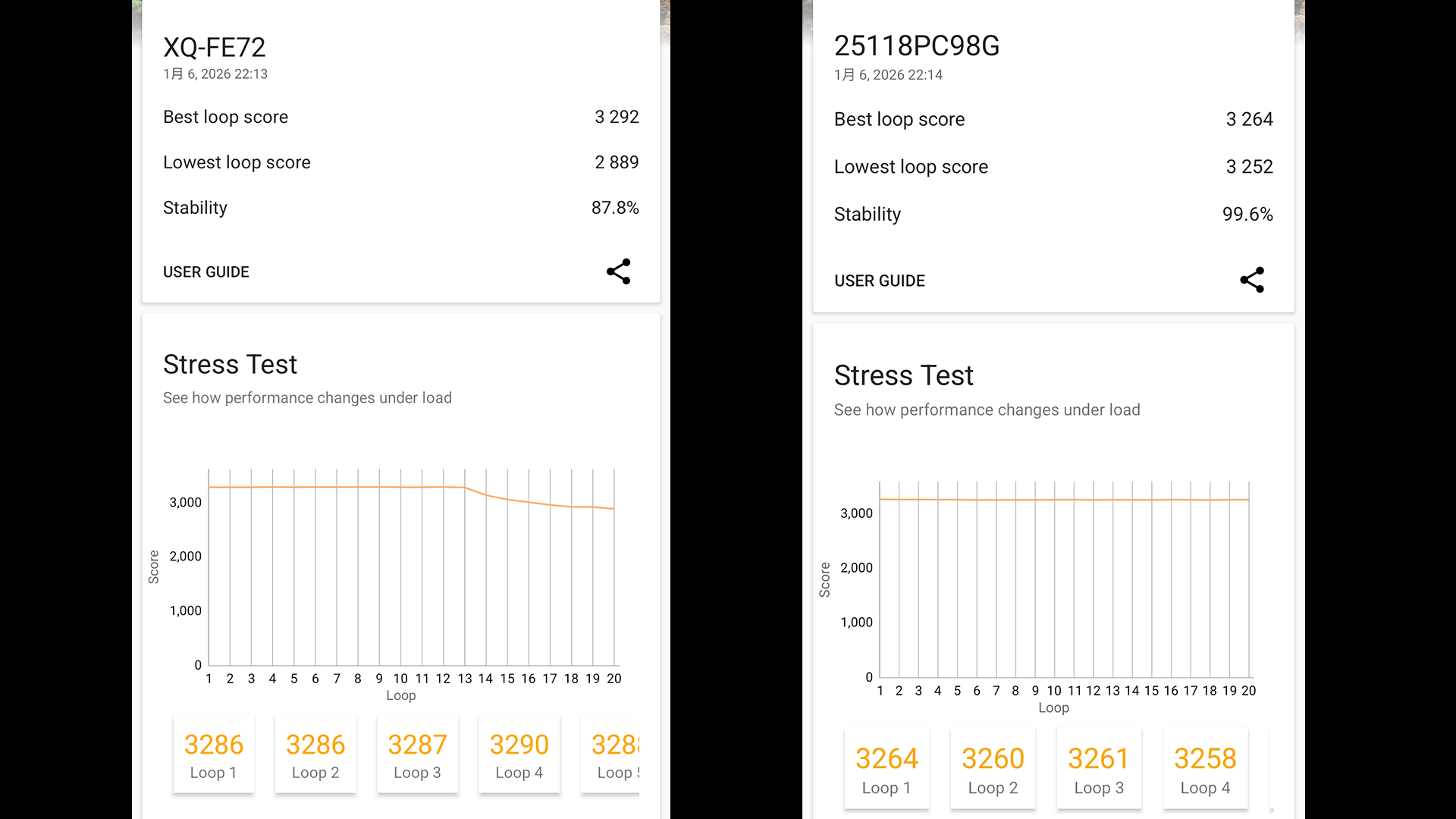 スコアでみるとほとんど差がない中でPOCO M8 5Gの方が安定率はちょっと高い感じです。ちなみに計測終了後に外部温度を計測したところPOCO M8 5Gは31.5度でXperia 10Ⅶは34.5度です。