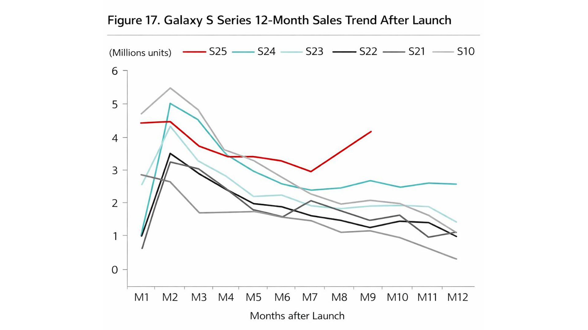 上記の画像は市場調査会社による歴代Galaxy Sシリーズの12ヶ月間における売り上げをグラフ化したものになります。その中で赤い線がGalaxy S25シリーズになりますが発売から8ヶ月目と9ヶ月目で売り上げが伸びていることを確認することが出来ます。