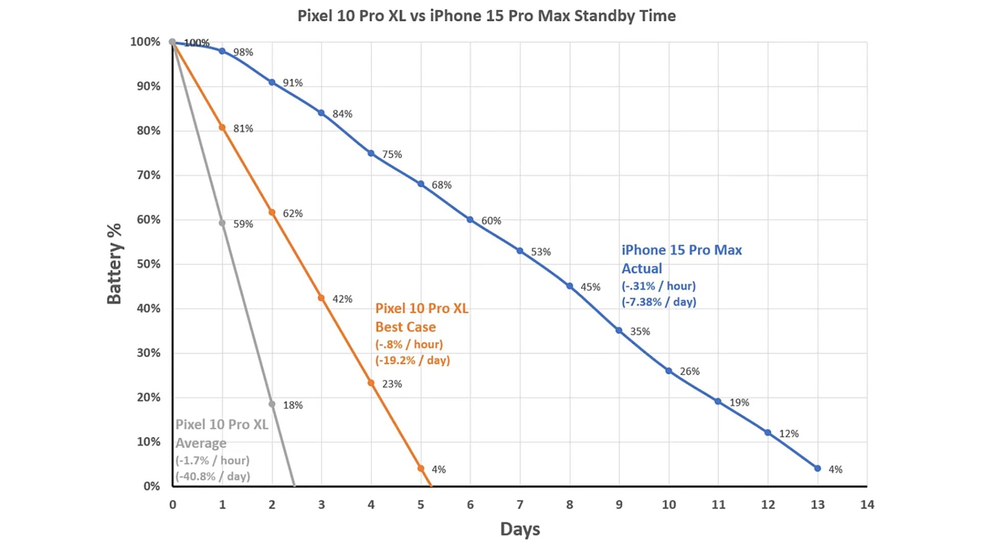 バッテリーの容量差を考えると、Google Pxiel 10 Pro XLは待機状態において、iPhone 15 Pro Max対比で1時間あたり3倍から6倍の消費電力が発生していることになります。