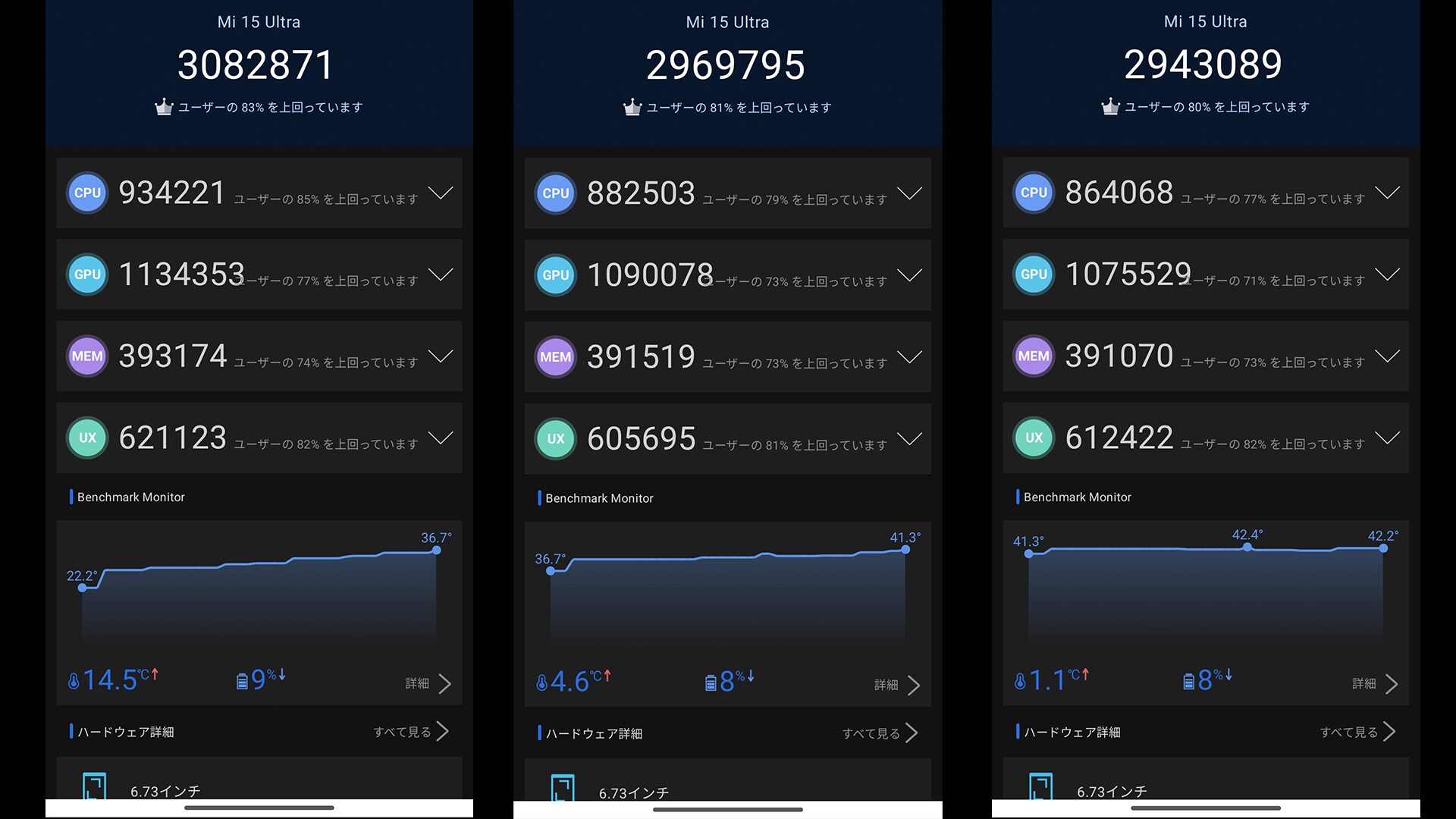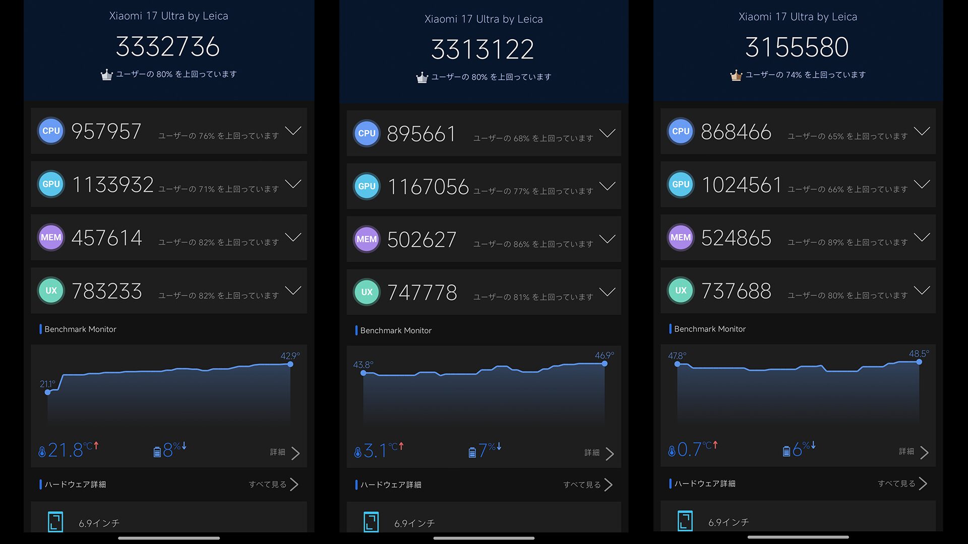 ちなみに計測終了ごとに外部温度を計測したところXiaomi 15 Ultraは33.1/38.2/37.3度でXiaomi 17 Ultra By Leicaは39.2/42.1/43.4度と発熱はしやすくなっている印象です。