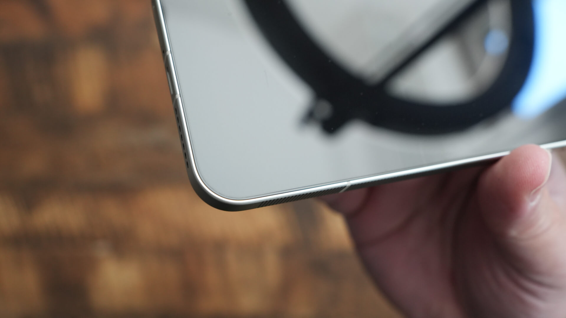 最後に本体下部を確認するとスピーカーグリルにマイクにUSB-CにSIMトレイとなっています。そしてサイドフレームはアルミを採用しつつフラット形状かつマット仕上げまでは従来通りです。