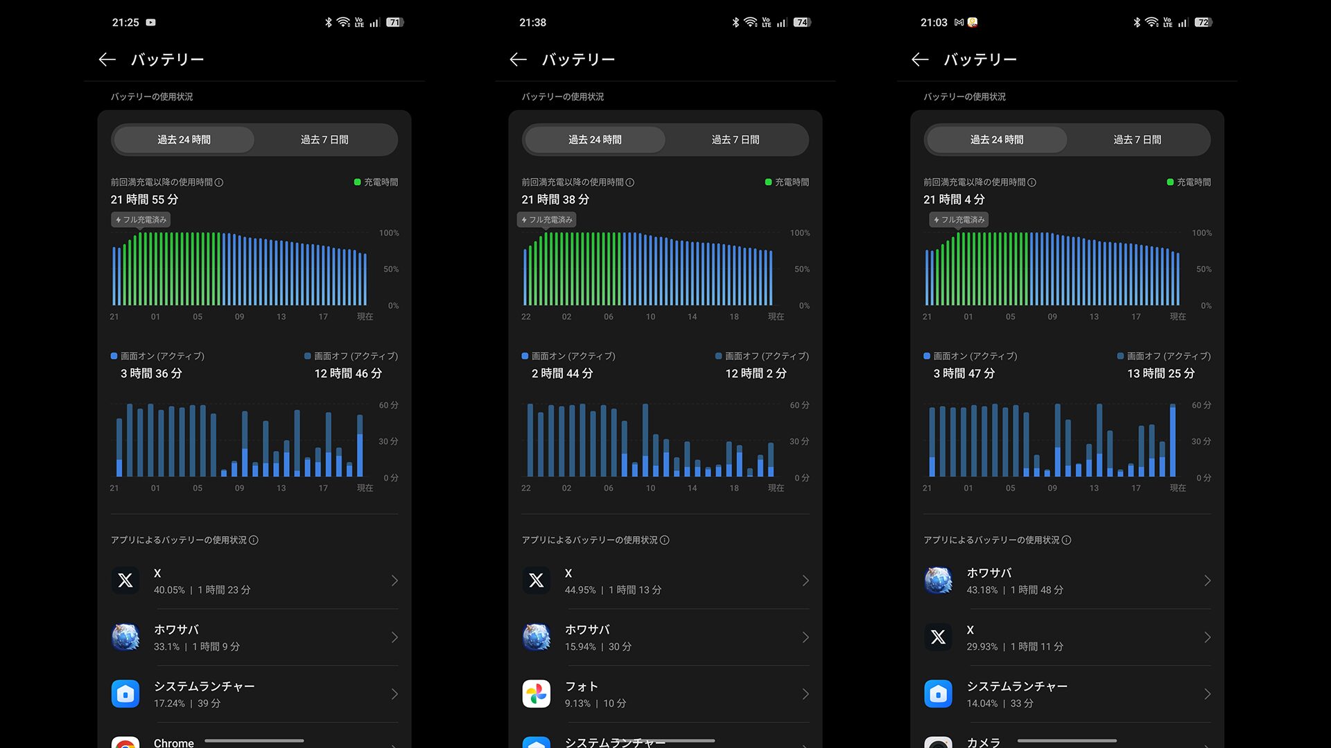 バッテリー容量が7025mAhと頭一つ抜けている感じで実際に使ってみると自分の使い方だと寝る前の電池残量が70%前後のことが多くGalaxy S25やPixel 10と比較してもかなり安定している印象を受けます。