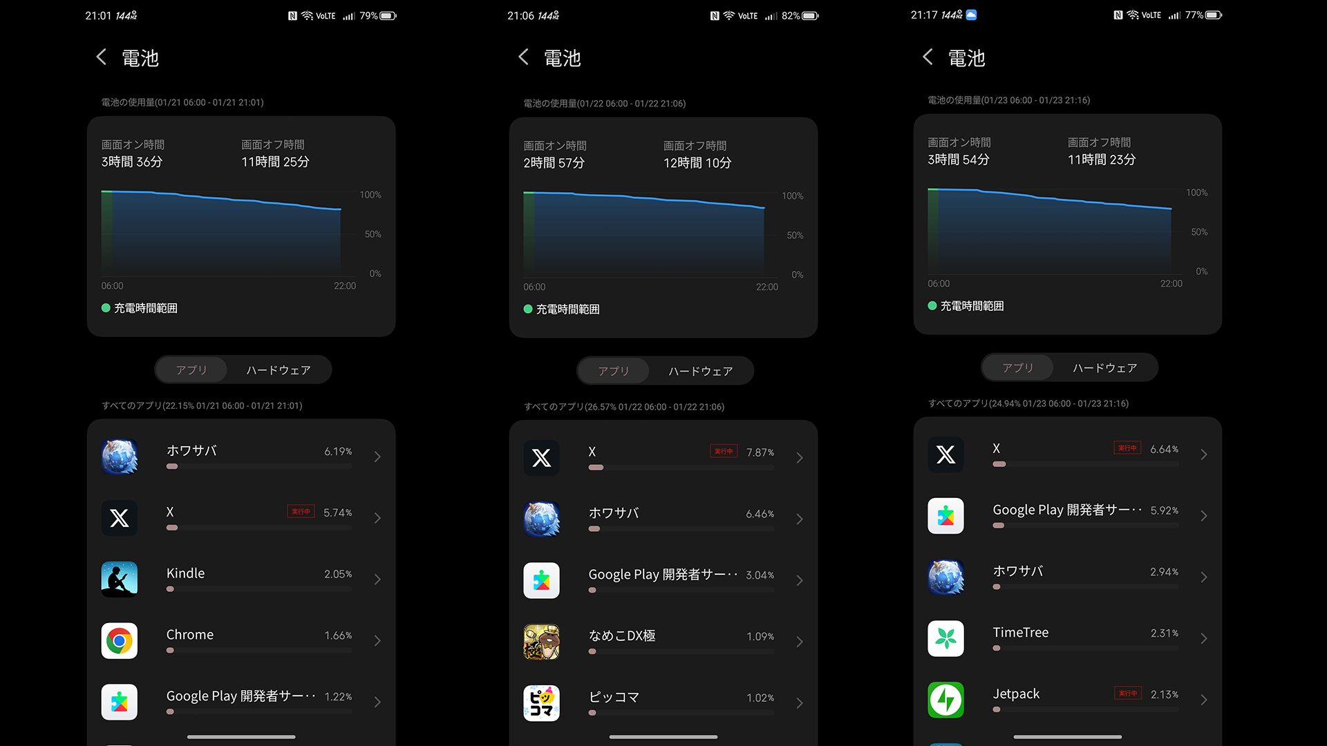 ただ両機種とも実際に短期間使ってみると寝る前の電池残量は80%前後と同程度になっています。