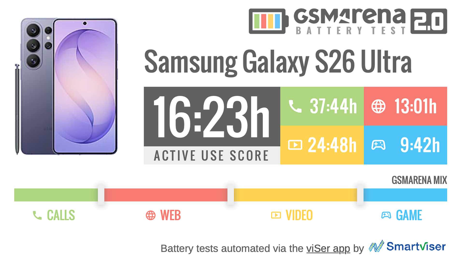 Samsungはこの5,000mAhバッテリーからわずかながら性能を引き出すことに成功しています。おそらくソフトウェア最適化によるものです。S26 Ultraは、ウェブブラウジングと動画ストリーミングという2つの重要なテストで、前モデルよりわずかに良い結果を記録しました。それでも、アクティブ使用時間16時間23分というスコアは前世代より改善されており、単体で見れば十分優秀です。