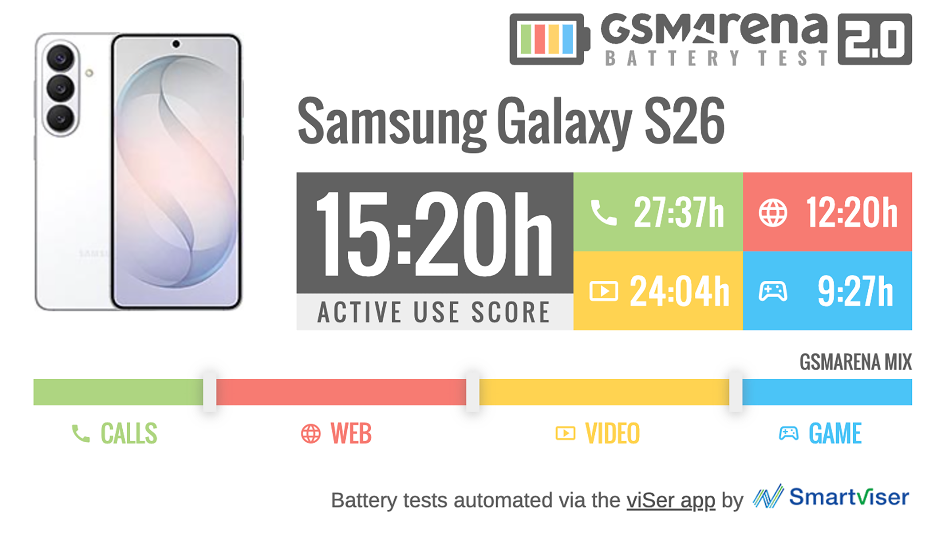 今回GSM ArenaがGalaxy S26のバッテリーテストの結果を公開していることが判明しました。ちなみにライバル機種のスコアを確認すると以下のようになります。
