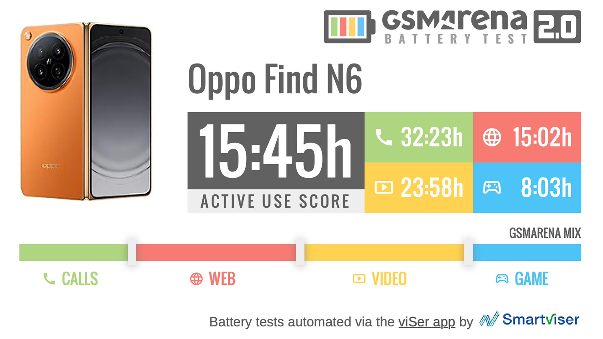 次に通常のバータイプでみればOppoのフラグシップは電池持ちがかなり安定しているからこそOppo Find N6の電池持ちにも期待している感じで海外サイトを参考にすると15時間45分です。